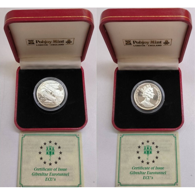 @ESTUCHE y CERTIFICADO@ GIBRALTAR 14 ECUS / 10 LIBRAS 1993 EUROTUNNEL y TREN KM.479 MONEDA DE PLATA PROOF