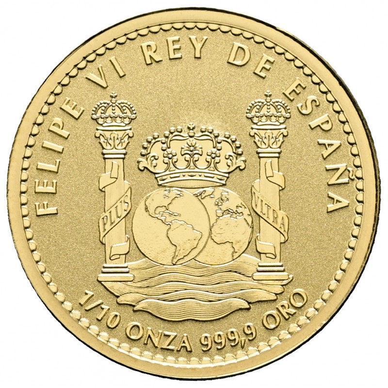 En el anverso se reproducen los motivos y leyendas de un real de a ocho, de tipo columnario: dos hemisferios bajo corona real, flanqueados por las columnas de Hércules con el lema PLUS ULTRA, todo ello sobre un mar con oleaje. En la parte superior, de izquierda a derecha y manera circular rodeando la imagen: la leyenda FELIPE VI REY DE ESPAÑA. En la parte inferior de la moneda, la leyenda: 1/10 ONZA 999,9 ORO. Rodeando el motivo y las leyendas aparece una grafila de piñones.